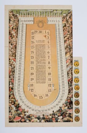 Sällskapsspel, "De olympiska spelen". Spelplan av papper med färgtryck. Stadion med publik runtomkring. I mitten av spelet finns tryckta spelregler. Längs högra kanten finns tryckta medaljer avsedda att klippas ut. Ovanför dem en bortklippt bit där figurer att användas som spelpjäser troligen suttit.