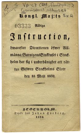 Kongl. Maj:ts nådiga instruction, hwarefter Directionen öfwer Allmänna Garnisonssjukhuset i Stockholm har sig i underdånighet att rätta; Gifwen Stockholms slott den 18 maji 1832.