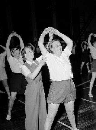 Husmödrar tränar gymnastik i Medborgarhuset. Birgit Rydin instruerar Karin Åkesson