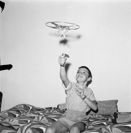 Falsterbovägen 10. Nioårige Kjell Roberg, som ska spela Kalle Nubb i ""Åke och hans värld"" i TV, leker här på bilden i sitt hem med en helikopter