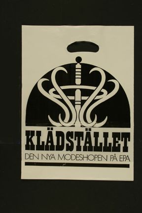 Vit plastkasse från Klädstället, en modeshop på varuhuset EPA. Kassen har svart tryck mot vit bakgrund på bägge sidor. Motiv: ett klädställ och under bilden text i svart: "KLÄDSTÄLLET DEN NYA MODESHOPEN PÅ EPA".