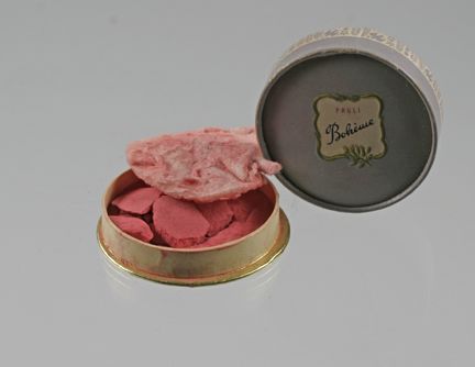 Mindre rougeask av papp med delar av innehållet och en applikator av bomull kvar. Asken är klädd med dekorativt papper; guldfärgat på underdelen och mönstrat grått på locket. På locket en fastklistrad etikett av papper med texten: "PAULI Bohème", inramad av en grön växtslinga. Tillverkad av parfymeri F. Pauli, Stockholm, troligtvis tidigt 1900-tal.