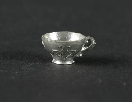 Dockskåpsinventarie. Kaffekopp av gjutet tenn med slingdekor i relief på sidorna. Under botten bokstaven "G" i relief.