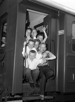 Östra station. Barn reser från Stockholm till Barnens ö i Roslagen för att vara på kolonier i två månader. Sammanlagt reste 1700 barn till kolonier på Barnens Ö