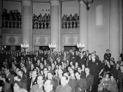 Sveavägen 65, Handelshögskolan. Åhörare vid SACO - Sveriges Akademikers Centralorganisations informationsmöte i Handelshögskolans aula