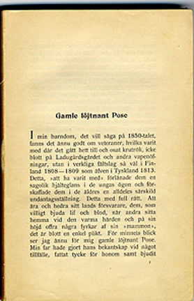"Gamle löjtnant Pose" är ett kapitel ur Adolf Hellanders bok Stockholmstyper, en samling texter om de original man kunde se i Stockholm på 1800-talet. 6 sidor.