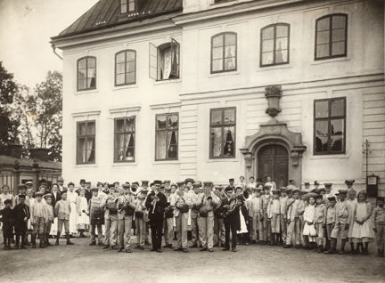 Uppställning på gården med musik framförd av musikkåren. Frimurarbarnhuset i Kristineberg, 24 juni 1909