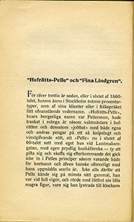 "Hofrätts-Pelle och Fina Lindgren" är ett kapitel ur Adolf Hellanders bok Stockholmstyper, en samling texter om de original man kunde se i Stockholm på 1800-talet. 6 sidor.