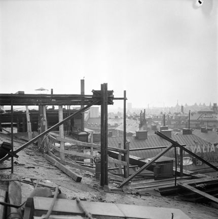 Korsning Malmskillnadsgatan och Hamngatan. Rester av Telefontornet, efter brand. Järnbalkar plockas bort från taket