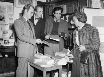 Stureplan 4, Hedengrens Bokhandel. Författarna Bernt Erikson, Harald Forss och Peter Weiss försöker sälja sina alster bakom en provisorisk disk, ""Poets corner"", under Bokens Vecka