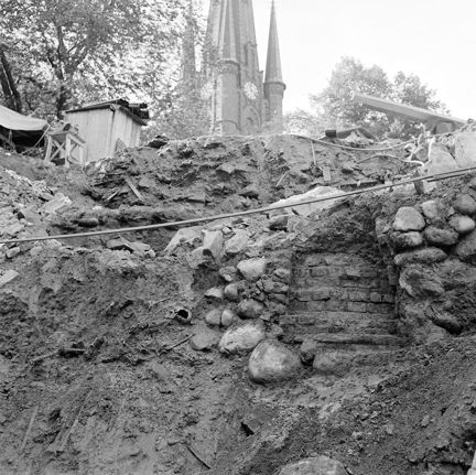 Schaktning i kv. Hägern Större. Ett skelett blottar sig i leran. Klara kyrktorn i fonden.