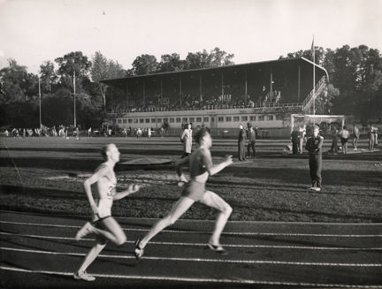 Löpare på väg in i kurvan, Kristinebergs Idrottsplats.