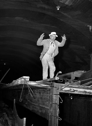 Filminspelning av filmen ""Tull-Bom"" med Nils Poppe. Nils Poppe spelar en tulltjänsteman och jagas i den nästan färdiga delen av tunnelbanan under Fridhemsplan
