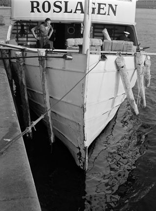 Skärgårdsbåten Roslagen har bucklat till stäven mot kajen