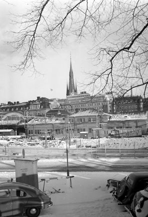 Vy mot Centralstationen från Klara Strand. Klara kyrktorn i fonden