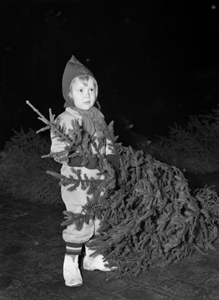En flicka bär på en gran. 1942 kostade en normalgran 5 kronor och en bordsgran 1 krona