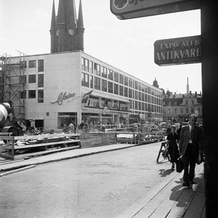 Klarabergsgatan 31-35. Ny bebyggelse i Klara, modehuset Claire. Huset fungerade också som evakueringshus åt företag som förlorat sina lokaler. T.v. Klara kyrka