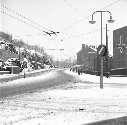 Korsningen Folkungagatan/Tegelviksgatan. Liljeholmens Stearinfabrik vid Danvikstull. Första söndagen med fri bensinförsäljning efter oljekris