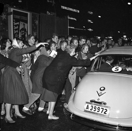 Biblioteksgatan 26, Biograf Anglais. Uppståndelse när Tommy Steele lämnar/anländer till konserten i bil