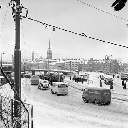 Katarinavägen. Bilar tar sig fram genom snön vid Slussen. Vy mot Gamla Stan