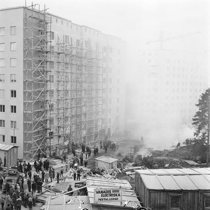 Filipstadsbacken. En brand utbröt i tre arbetsbaracker i det nya bostadsområdet i Farsta