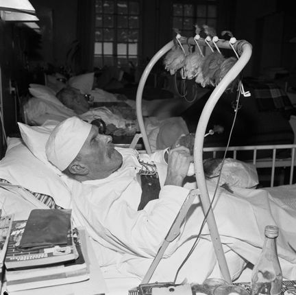 Vårdhemmet Högalid. Alfred Fröberg ligger i sin säng och tillverkar prydnadsfåglar (arbetsterapi)