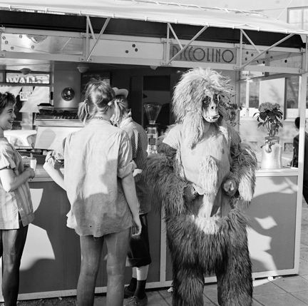 Uteservering i ""Piccolino Bar"". Utklädda människor, bland annat en i gorillakostym
