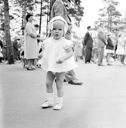 Liten flicka i spetsklänning på skolgården, i bakgrunden föräldrar som deltar i skolavslutning. Enskedefältets skola