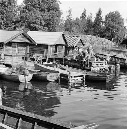 Fiskeläge i Rävsnäs med bryggor och sjöbodar. Scouter med packning på brygga