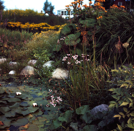 Blommor vid damm, Källhagen. Värdshuset skymtar i fonden