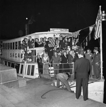 Folksamling på ångbåten Saga som bl.a lägger till vid Tranholmen och Norra Lidingö.