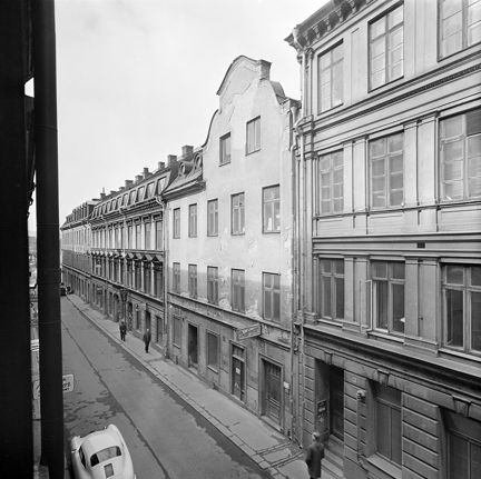 Herkulesgatan västerut från nr. 20-26. Herkulesgatan 22 är huset med gavelröste
