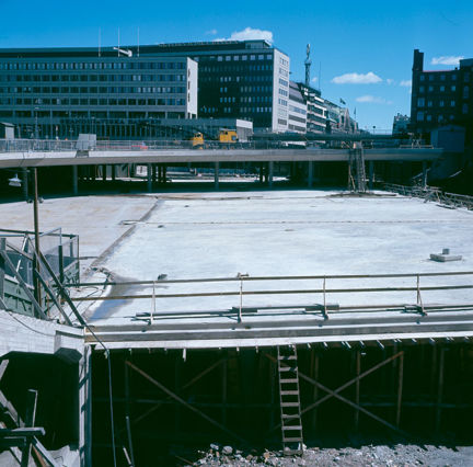 Sergels Torg under uppbyggnad. Vy österut från Drottninggatan