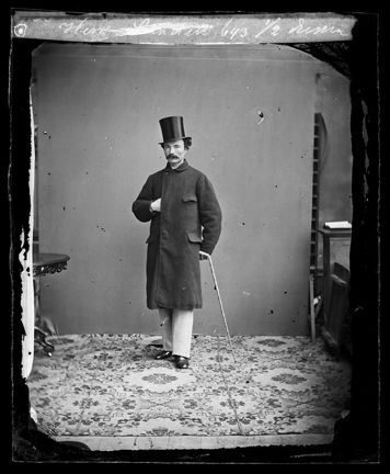 Porträtt av herr Sandell i ytterrock, hög hatt och promenadkäpp