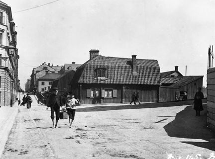 Åsögatan 16 österut från Västgötagatan 1 (t.h.). Åsögatan 16 är nuv. Åsögatan 102-106. Genom kvarteret går nu Söderledstunneln och här byggdes Skattehuset 1955-1961