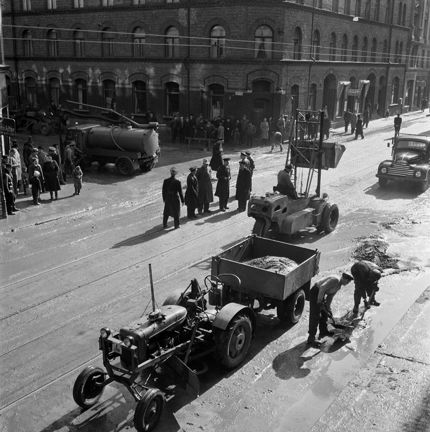 Korsningen Ingemarsgatan-Roslagsgatan. Gatuarbeten efter översvämning. Huvudventilen i Vanadislundens vattenreservoar gick sönder och åtta miljoner liter vatten forsade ner för berget