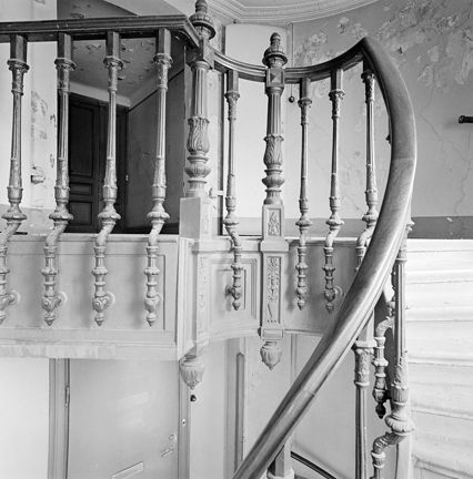 Drottninggatan 23. Trapphuset med detalj av trappräcket vid översta våningsplan