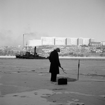 Vinterfiske på Årstaviken. Södersjukhuset i fonden