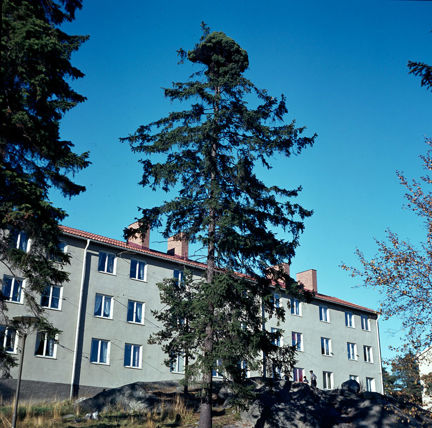 Gran med s.k. "häxkvast" i toppen. I bakgrunden hus på Sjösavägen 147-151 i Bandhagen