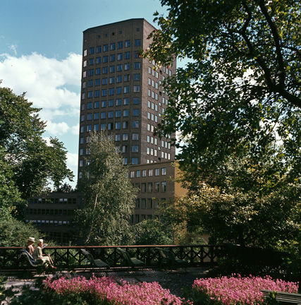 Planteringar i Vasaparkens västra del. Bonnierhuset i fonden