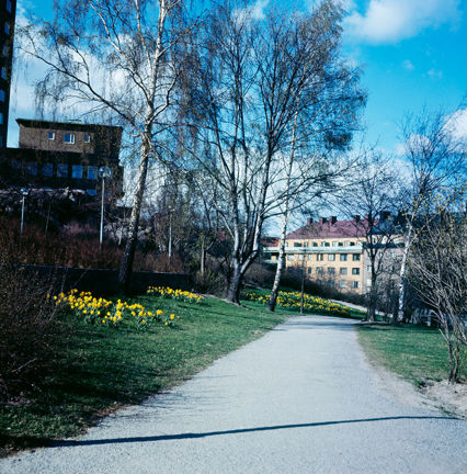 Påskliljor i parken (nuv. Sankt Göransparken) sydost om Kvinnohuset i östra Stadshagen. Vy åt norr mot kv. Dykaren