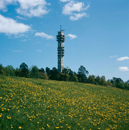 Kaknästornet under byggnad. Fält med maskrosor