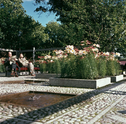 Planteringar och fontäner i Vasaparkens västra del. Män sitter på rödmålad parkbänk