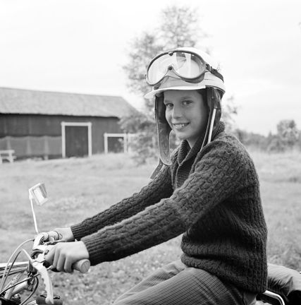 Mats Lindgren på cykel, med mopedhjälm och skyddsglasögon
