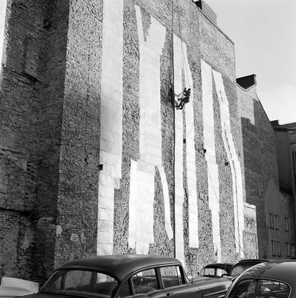 Rivningstomt med parkerade bilar i kv. Uppvaktaren. Arbetare upphissad med linor framför brandmur med plåttäckta rökgångar