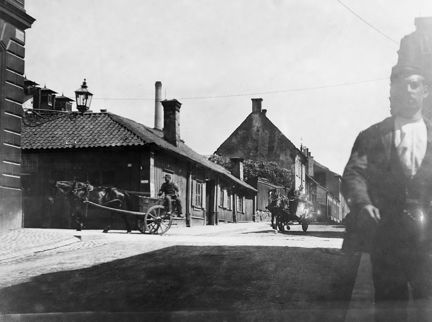 Åsögatan österut från Götgatan. Hästfordon ses vid Åsögatan 11. Nuv. Åsögatan 111