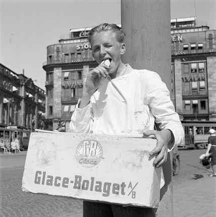 Tegelbacken. En ung glassförsäljare äter glass, med en glasslåda från Glace-Bolaget (GB) på magen. Centralpalatset i bakgrunden