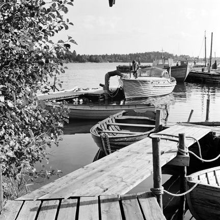 Fiskeläge i Rävsnäs med brygga och förtöjda båtar