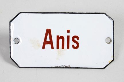 Lådetikett av emaljerad plåt med vit bottenfärg, svart kant runt om och text i rött: ”Anis”.