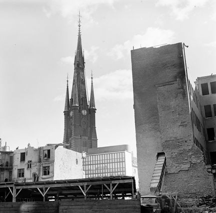 Rivningar i Klara. I bakgrunden Klara kyrkas torn